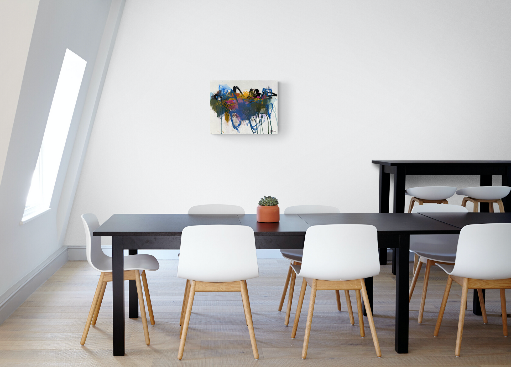 This is a 24 x 20 inch “ spraypaint and acrylic work of fun and movement, gloss varnished. This piece is being offered at 25% off the listed price. :) It's a lively, rhythmic painting which doesn’t need framing, [ but framing would make it more substantial for sure ;'}}} and sides are 1 and a half inches deep so it pops off the wall at a nice depth.