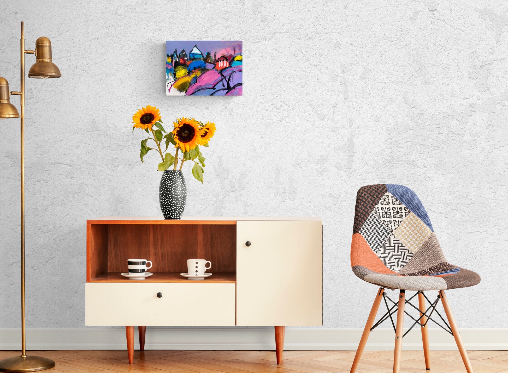 Lively abstract architectural landscape, acrylic on canvas. Available from Revelry Fine Arts https://www.revelryfinearts.com/